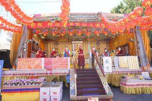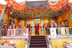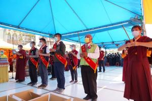 隨後在所有弟子的迎請中,金剛上師恆性嘉措仁波且陞座,仁波且致詞表示:感謝諸位貴賓今天蒞臨現場一同祈福,尤其是永昌里王朝益里長出了非常多的力。行動佛殿佛光遍照祈福法會就是集結眾人的力量,共聚善緣,讓大家都能安居樂業。身為佛教徒,我們要放下萬緣,才能安心無礙,身心愉快,今天也教導大家一起做深呼吸,吸進光明之氣,吐出烏黑濁氣,祈請 南無第三世多杰羌佛 南無本師釋迦牟尼佛 讓台灣祥和樂利、眾人身體健康,吉祥如意!如來正法大放光明,永久昌盛!