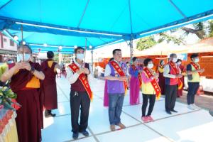8月18日本會邀請當地民意代表、政府首長、里長及社會賢達等人,一同來參加祈福法會,來為國泰民安、世界和平及一切眾生祈福。在恭迎 金剛上師陞座後,金剛上師恆性嘉措仁波且表示:感謝所有貴賓在微微細雨、百忙之中來到行動佛殿現場,行動佛殿的目的就是集結眾人的善願,共同誦經讓功德力超越因果業力,轉業轉運,今天教導大家一起來做深呼吸,吸進光明之氣,吐出烏黑濁氣,在情緒不好、行車疲累時做深呼吸,就可以讓原本心浮氣躁的情緒平穩下來,減少不幸的狀況發生,希望全民都能一起來做深呼吸運動。祝願大家身體健康,吉祥如意,祈請 南無第三世多杰羌佛 南無本師釋迦牟尼佛 十方諸佛菩薩,為國泰民安、世界和平、一切眾生祈福,讓世界永遠光明昌盛,如來正法永放光芒。