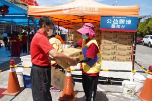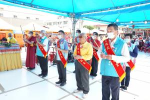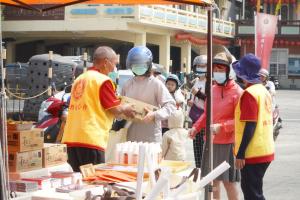 吳茂樹區長表示:感謝該會行動佛殿至仁武區為大眾祈福,目前新冠疫情嚴峻大家除了要戴好口罩,更要測量額溫、手部清潔,做好防疫措施,今天除了感謝該會不遠至仁武祈福,更帶來物資一份十個口罩及酒精給每一戶弱勢家庭,這真是現在非常需要的,祝福大眾身心健康。天后宮主委吳政服則表示星期四就看到義工師兄姊來此布置場地,天氣相當炎熱,大家要注意不要中暑了,也希望能天降甘霖,法會圓滿成功。